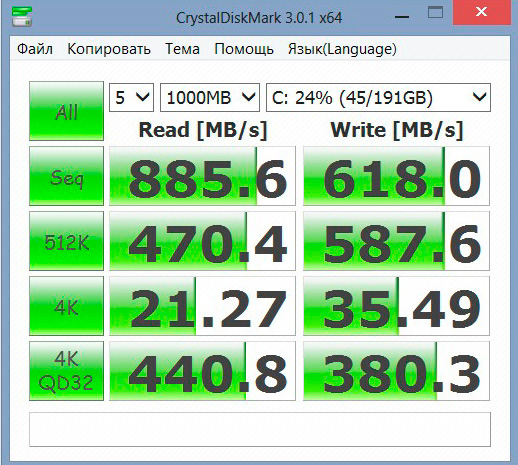 Ну и сравним в тестом моего предыдущего ноутбука ASUS Zenbook UX301LA с RAID0 (обратите внимание, что в новом CrystalDiskMark два последних теста поменяли местами).