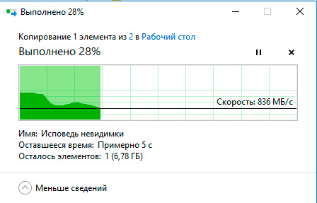Проверил скорость копирования 10-гигабайтного файла на диске ноутбука.