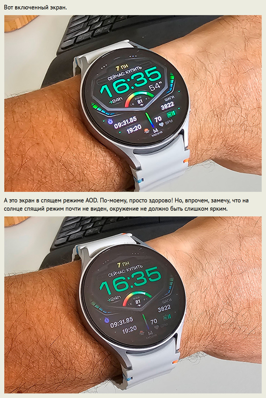 А еще сделал две пробежки в солнечный день с Самсунгами. Дисплей в режиме AOD на солнце нечитаем, а переход из него занимает почти секунду. Это безумно много, когда хочешь за мгновение посмотреть на текущие показания.