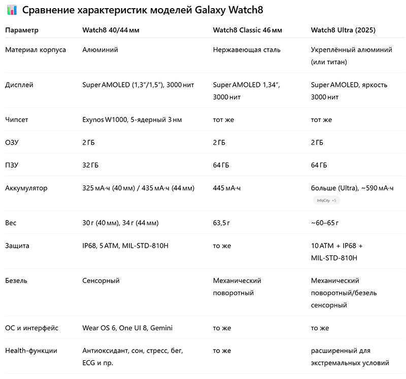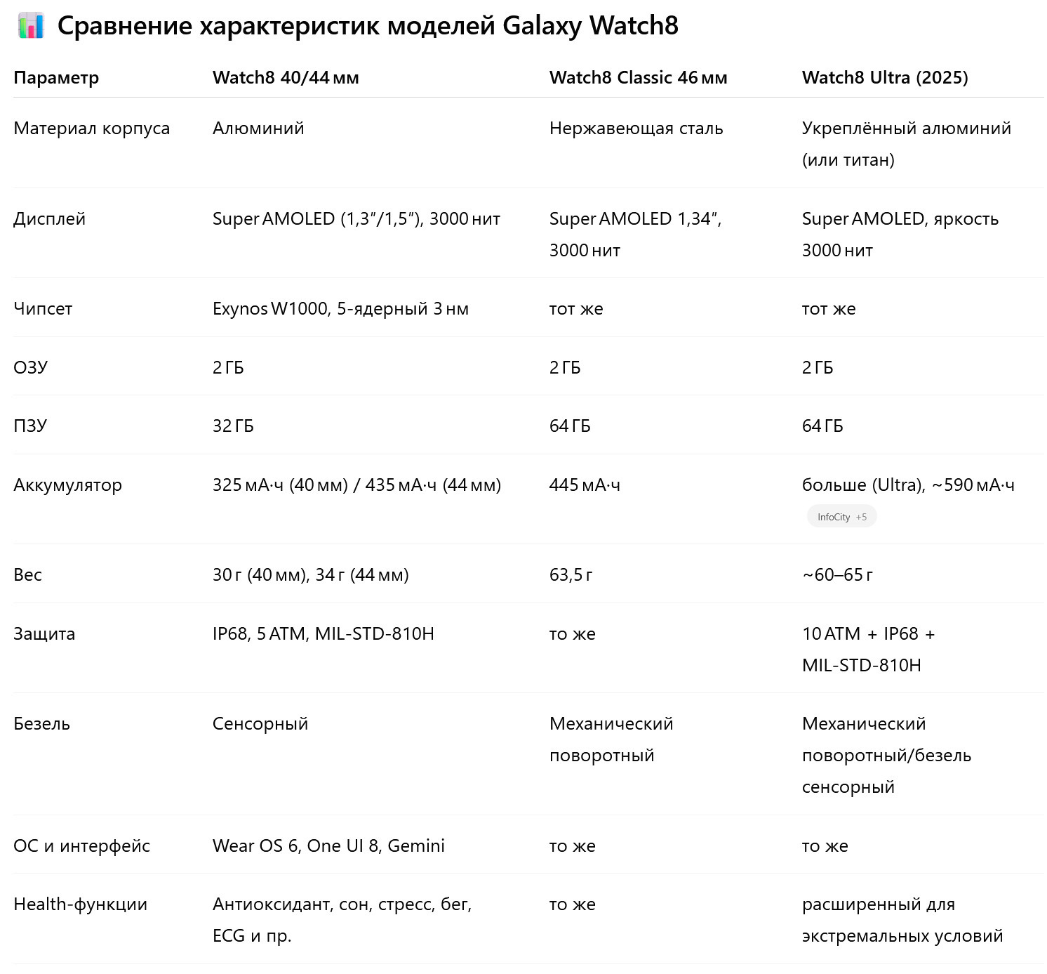 Все три модели получили дисплей на матрице Super AMOLED с яркостью аж 3000 нит, и процессор Exynos W1000, операционную систему Wear OS 6 с оболочкой One UI 8, а в остальном различаются дизайном, материалами, памятью и емкостью аккумулятора.