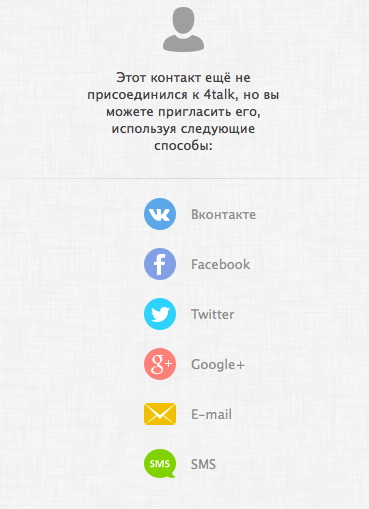 В списке контактов ниже есть абоненты, у которых еще не установлен 4talk (к счастью, таких остается все меньше и меньше). Если нажать на такой контакт - справа появятся все возможные варианты приглашений посредством любых средств связи и социальных сетей.