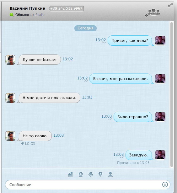 И вот с удалением сообщения здесь нужно пояснить один важный момент. Дело в том, что если вы удалите свое сообщение (а чужие по отдельности удалять и нельзя), то оно автоматически будет удалено и во всех ваших устройствах, и во всех устройствах вашего собеседника. Это делает только 4talk, в других мессенджерах ничего подобного нет.