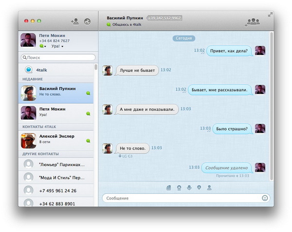 И это очень удобно для случаев, когда вы случайно отправили сообщение не тому человеку: сколько пользователей кусали себе локти и другие части тела, когда по недосмотру отправляли сообщение не тому абоненту, которому оно предназначалось. Так вот, только в 4talk эту ошибку можно быстро исправить.