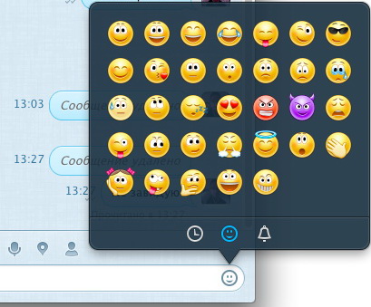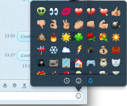 При нажатии на пиктограмму, расположенную справа в строке ввода, появляется следующее меню "смайликов".