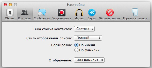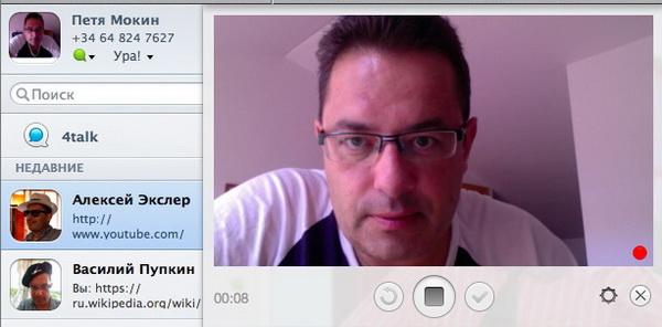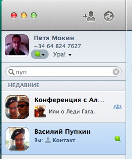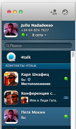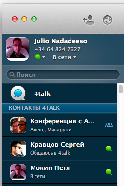 Если же вы регистрировали уже имеющуюся запись, то 4talk немедленно туда подтянет все ваши контакты, конференции, разговоры, обмен файлов и так далее. Вот, например, как выглядит на маке мой обычный аккаунт в 4talk через несколько секунд после подключения.