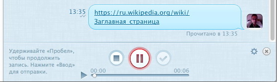 При его нажатии появляется окно ввода сообщения, где при готовности нужно нажать на кнопку микрофона: после этого записывается сообщение размером до двух минут. Также вы можете нажимать и держать пробел, чтобы запись производилась: при отпускании пробела запись встанет на паузу.