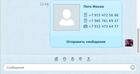 И последняя пиктограмма - отправка данных о контакте из списка вашему абоненту. Контакт приходит вот в таком виде, и ему сразу же можно написать сообщение.