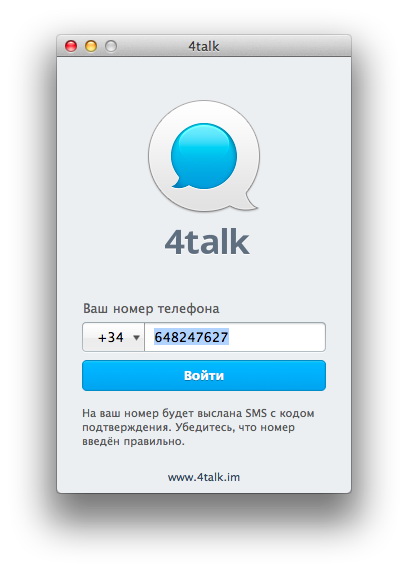 В процессе инсталляции нужно ввести номер телефона, который связан с вашей учетной записью 4talk, - на него придет SMS для подтверждения. (Номер может быть любого оператора любой страны.)