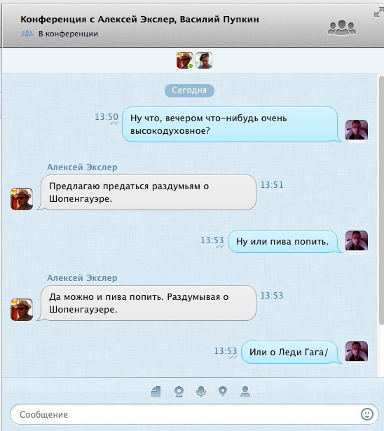 Вот, например, конференция, составленная из двух участников. (Формально это практически как обычный чат, тем не менее по возможностям - это именно конференция.)