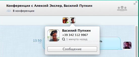 Интересно то, что ники (фамилии-имена) и их цитирования для каждого участника выглядят так, как этот ник записан у него в адресной книге. То есть если я у одного участника значусь как Alex Exler - он мой ник будет видеть именно так, а если у другого участника я записан как Карл Шкафиц - он будет видеть в конференции (и чатах) мой ник так, как записано у него.