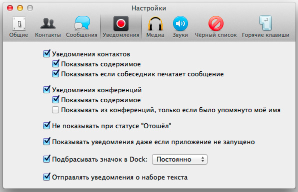 Настройка уведомлений. Очень полезная опция - не мигать в области уведомлений, если сообщение адресовано не лично вам. (А то активная переписка в конференции может изрядно утомить своими сигналами.)
