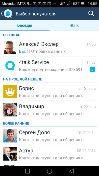 Диалог пересылки (когда нужно поделиться текстом или медиафайлом с какой-то группой получателей) стал заметно удобнее: теперь там есть сегодняшние, недавние контакты и все контакты 4talk в отдельной закладке.