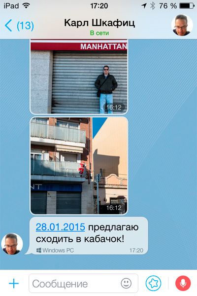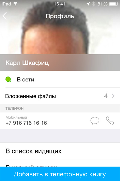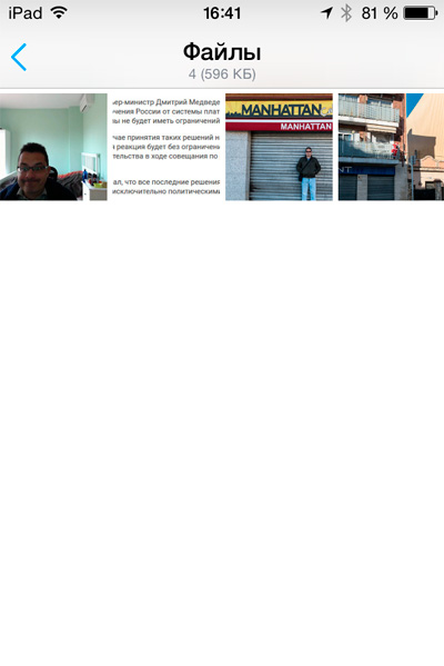 Еще одна интересная новая возможность при работе с изображениями. Теперь в айфонном-айпадном приложении можно отдельно увидеть все медиафайлы данного чата (конференции) или данного контакта.