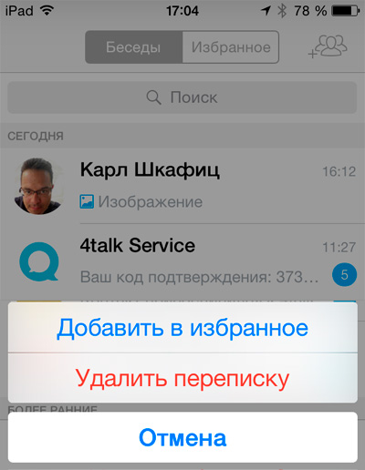 Если на беседе в списке сделать свайп влево - появится следующее меню действий: там можно беседу добавить в избранное (это все, разумеется, будет синхронизироваться по всем устройствам данной учетной записи), также беседу можно удалить. (Напоминаю, что в 4talk при удалении беседы сообщения также будут удалены и на всех других ваших устройствах.)