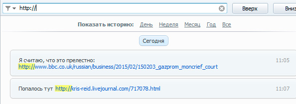 Это также не нововведение - возможность изначально была в клиенте под Windows. Просто я попросил разработчиков сделать так, чтобы можно было в разговоре отобрать все гиперлинки, - и оказалось, что это и так вполне возможно. Нужно просто зайти в историю беседы с абонентом или в конференции и там просто ввести http:// - отфильтруются все гиперлинки.
