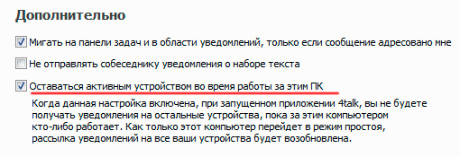 Очень полезная настройка, появившаяся в десктопных клиентах под Windows и Mac. Она позволяет не получать уведомления на мобильных устройствах в тот момент, когда вы работаете за компьютером. Это очень и очень удобно, а то раньше раздражало, что, когда я сижу за компьютером в 4talk, три смартфона и два планшета синхронно сообщают мне о пришедших сообщениях.