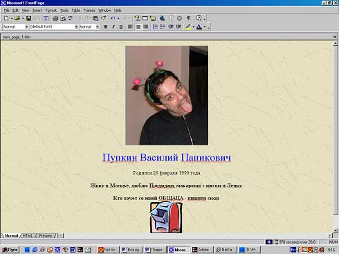 Внешний вид редактора Microsoft FrontPage 2000 и простейшая страница, созданная на нем