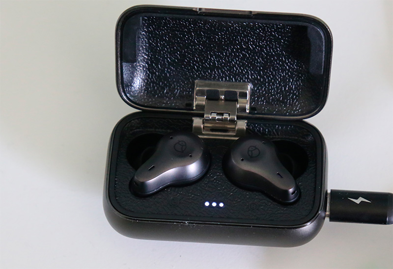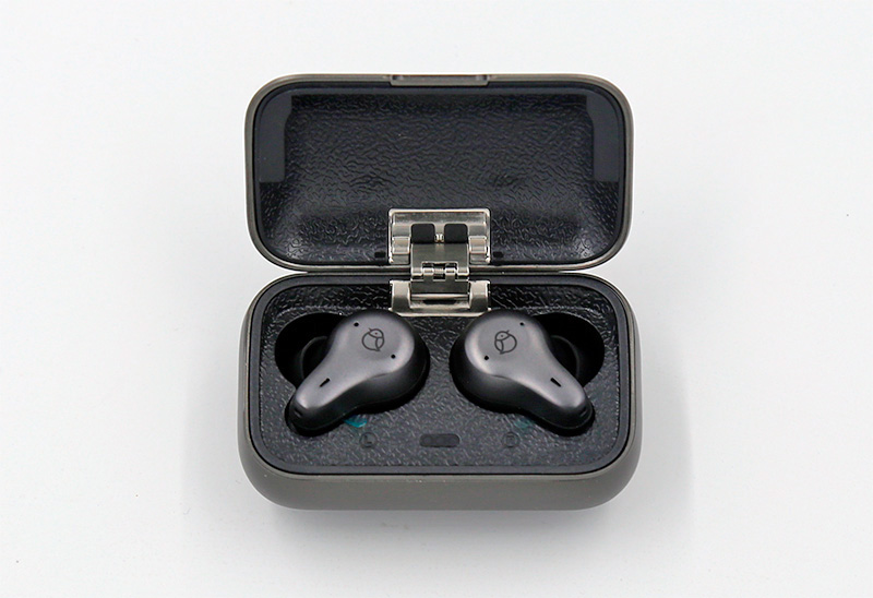 Зарядный кейс. Он очень необычный. Во-первых, когда берешь его в руку, сразу обращает внимание его вес - кейс металлический, причем, судя по всему, стальной. Его вес с наушниками - 75 грамм!