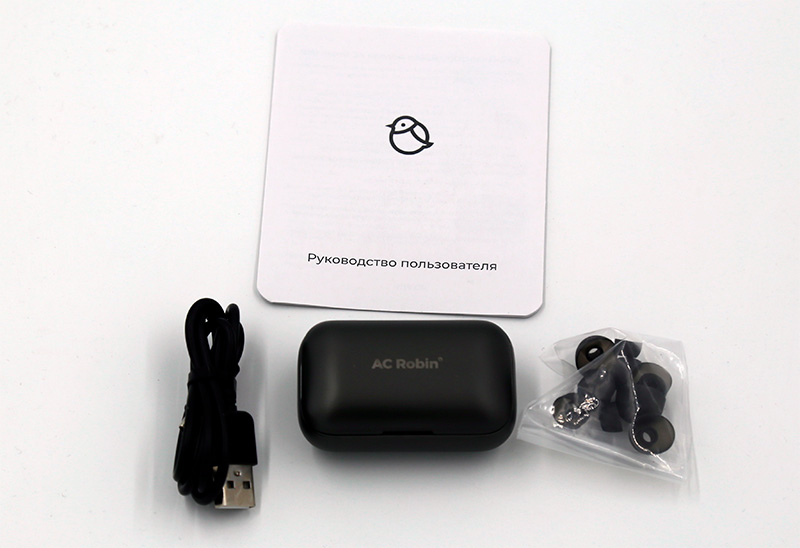 Комплект поставки: зарядный кейс с наушниками, кабель для зарядки, сменные амбушюры и руководство пользователя на русском.