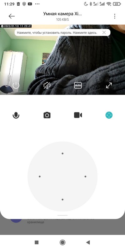 Настройка закончилась, камера среди остальных устройств приложения Mi Home, главное окно камеры. Приложение предлагает установить пароль для доступа к камере - оно, конечно, нелишнее.