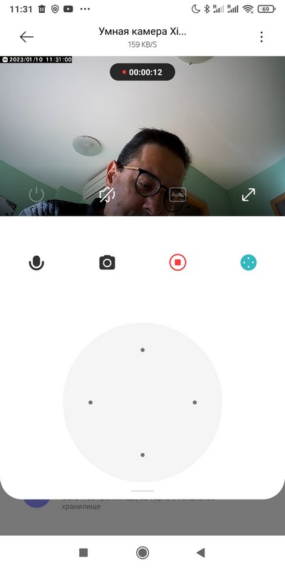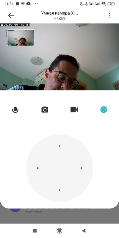 Интерфейс довольно простой: изображение с камеры, кнопка отключения, включение/выключение записи звука, качество записи (можно переключиться на 360p), видео на полный экран. Под видео с камеры - включение микрофона для воспроизведения звука на динамике камеры (например, для общения с ребенком, если камера используется в детской), снять фото, снять видео, пиктограмма управления камерой. Так как камера действительно охватывает 360 градусов вокруг себя, с помощью кнопок управления ее можно перемещать как угодно - это очень удобно.