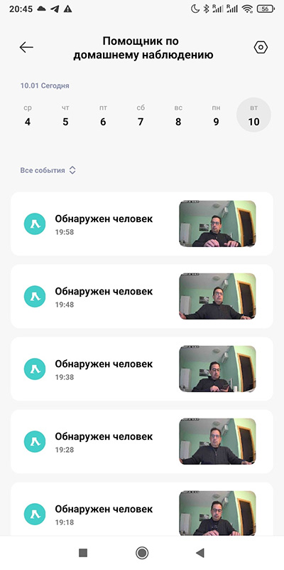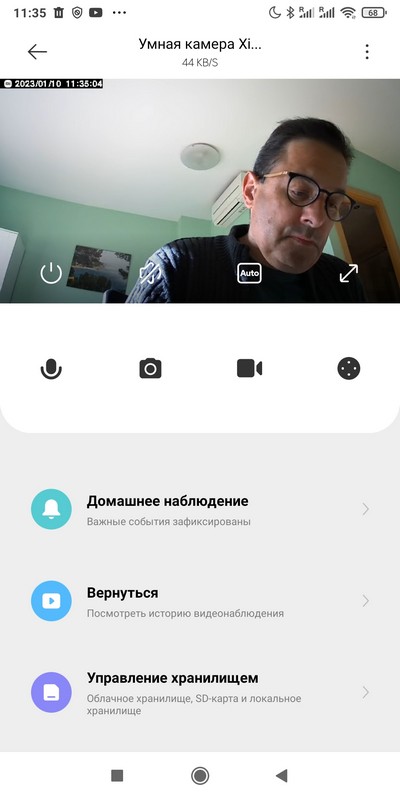 Общее меню управления камерой: просмотр зафиксированных событий, история видеонаблюдений, управление хранилищем.