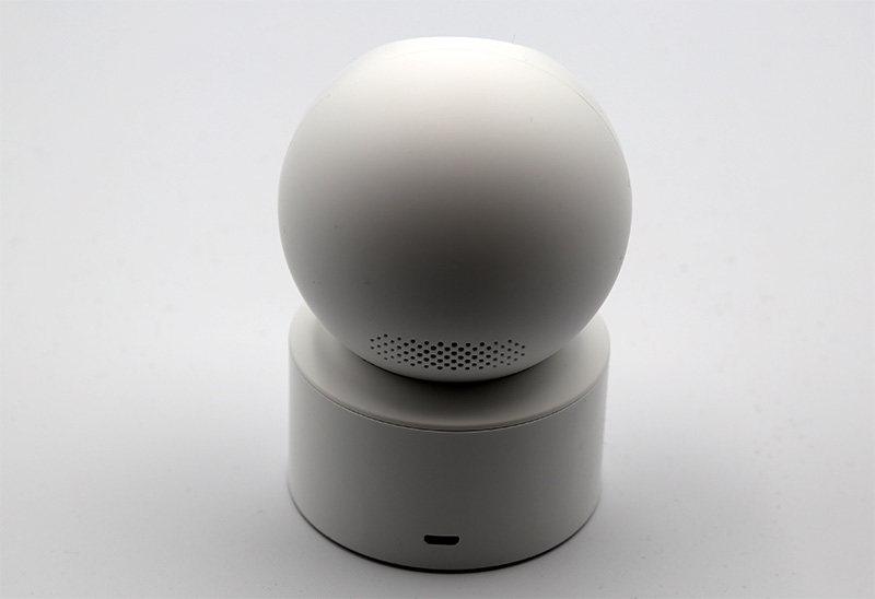 Белый пластик корпуса, черный пластиковый шар с камерой - это устройство хорошо впишется в любой интерьер.