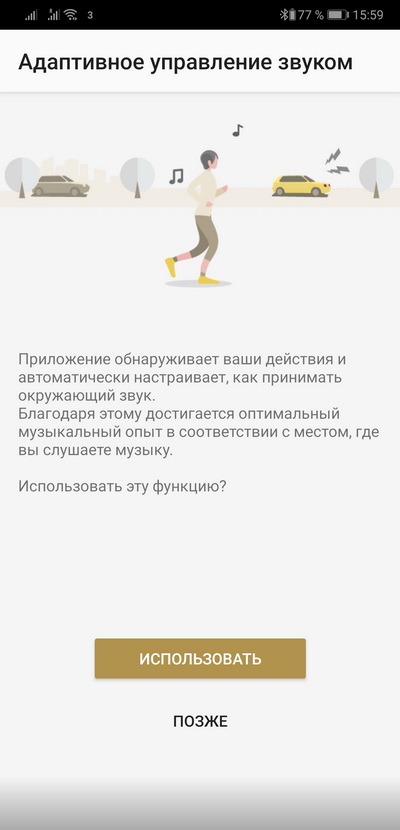 Автоматическая подстройка, насколько я понял, делается в зависимости от того, находится ли пользователь в покое или он двигается, например куда-то идет. Когда пользователь находится в покое, то шумодав работает на полную. Если же пользователь двигается, то шумодав, создавая, с одной стороны, блокировку внешних шумов, с другой стороны, старается оставлять слышными звуки, которые могут о чем-то предупреждать: громкие объявления по радио (вокзалы, аэропорты), гудки автомобилей и так далее. Ну и, повторюсь, с помощью приложения вы как угодно можете варьировать режим работы шумодава, чтобы, например, значительно приглушать посторонние шумы в офисе, но при этом не выпадать из общения и слышать, когда к вам обращаются.