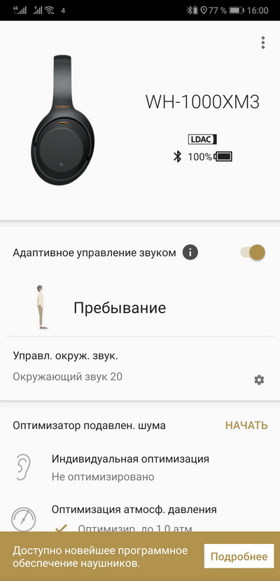 Некоторые пользователи ругаются на шумодав. И это еще более удивительно, потому что шумодав здесь действительно выдающийся. Потом выясняется, что режим Ambient Sound эти пользователи (и, кстати, некоторые журналисты) никак не настраивали и они понятия не имеют о наличии программы Sony Headphones Connect, через которую шумодав, да и параметры звучания, можно настраивать как угодно, - ну, тогда тоже тут нет никаких вопросов. Хотя, кстати, наличие подобных отзывов меня все равно страшно удивляло, потому что в этих наушниках по умолчанию включается именно самый мощный шумодав, который глушит абсолютно все, а режим Ambient Sound включается нажатием соответствующей кнопки (или запускается в приложении).