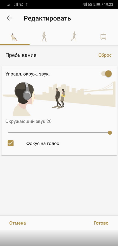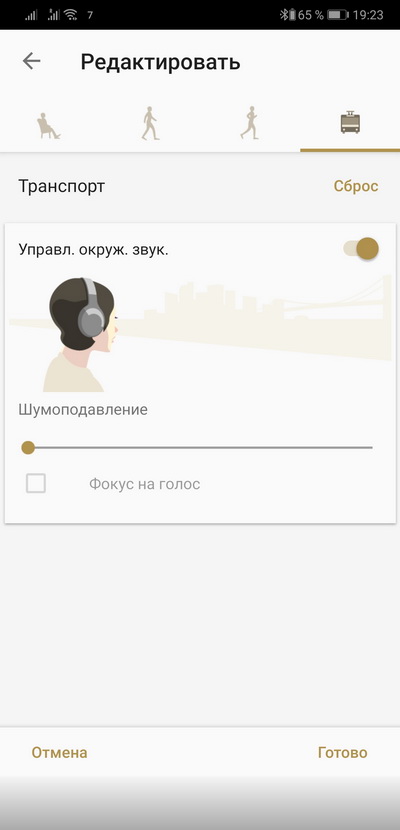 У этих же наушников шумодав в обычном режиме - уже отличный: от тебя практически полностью отсекаются все звуки и ты можешь погрузиться в прослушивание музыки. Однако далеко не во всех случаях пользователю нужна полная звуковая изоляция. И вот тут как раз интересно то, что шумодав, во-первых, может сам подстраиваться под действия пользователя и окружающую обстановку и, во-вторых, вы его можете настраивать в очень широких границах.