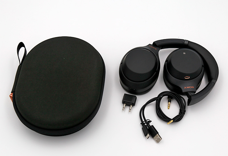Внутри чехла - наушники в сложенном компактном состоянии, аудиокабель длиной 1,2 метра, короткий кабель USB - Type-C для зарядки, самолетный переходник.
