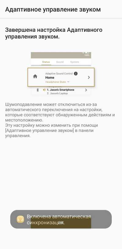 Адаптивное управление звуком может автоматически переключать настройки при определении местонахождения пользователя: дом, работа, на улице и так далее.