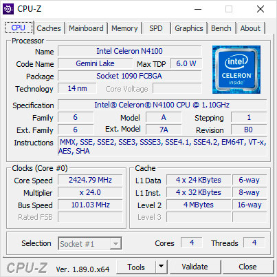 Процессор: Intel Celeron (Gemini-Lake) N4100, 4-ядерный, 2 ГГц