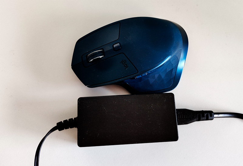 Замечу, что блок питания - очень маленький, по размеру заметно меньше, чем обычные блоки питания ноутбуков. Вот он рядом с мышью Logitech MX Master 2S.