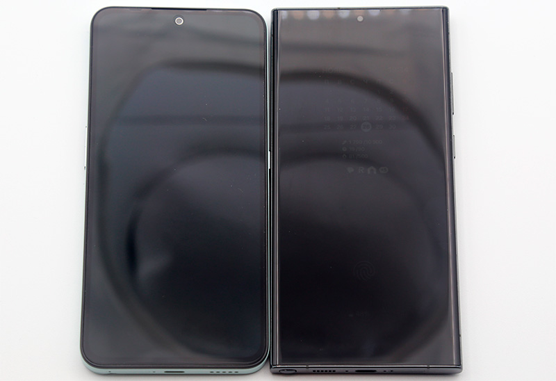 И вот этот смартфон рядом с моим Samsung Galaxy S23 Ultra. По размеру они похожи, но CMF Phone 1 легче на 36 граммов, и в руке тяжелым не ощущается, в отличие от S23 Ultra.