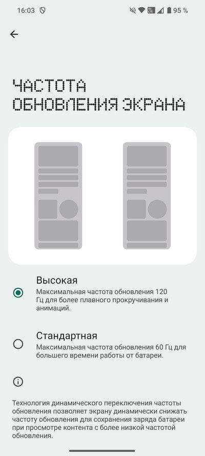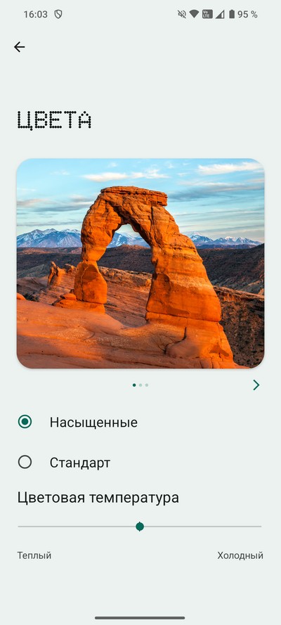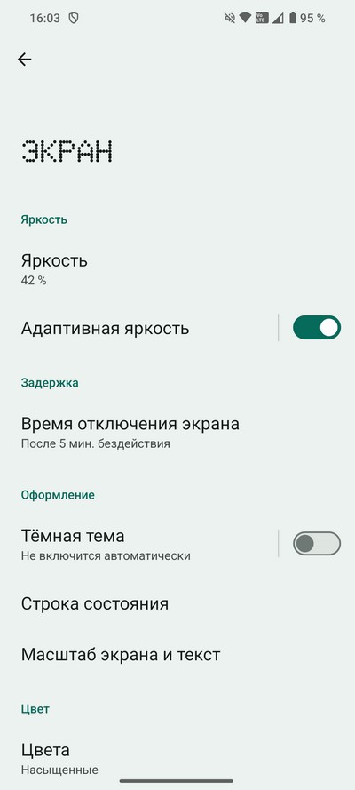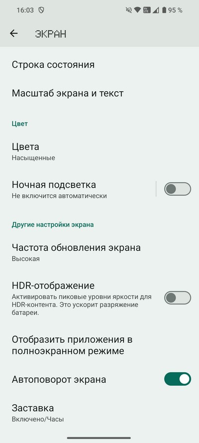 В настройках экрана можно включать темную тему, ночной режим, менять размер шрифта и масштаб, задавать частоту обновления экрана.
