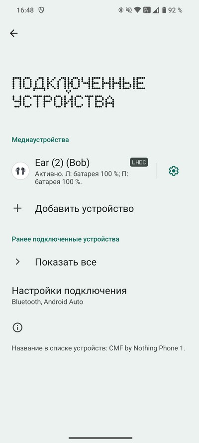Для проверки беспроводного звучания подключил "родные" для этого смартфона наушники Nothing Ear (2), они подключились по кодеку LHDC.