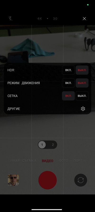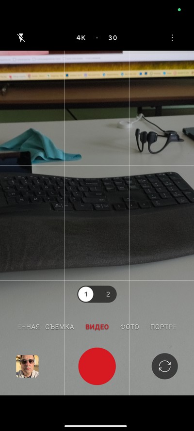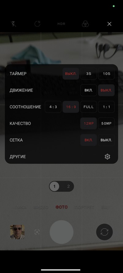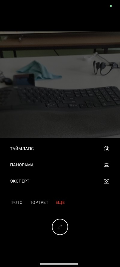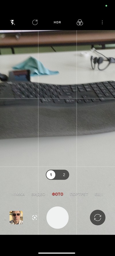 Интерфейс камеры. Снизу переключаются режимы: замедленная съемка, фото, видео, портрет, остальные режимы (это все настраивается). Выше идет переключение между основной камерой и цифровым зумом (по умолчанию 2-кратный, но можно вызвать линейку зумов и масштабировать до 10-кратного). Сверху - пиктограммы различных переключателей и пиктограмма меню.