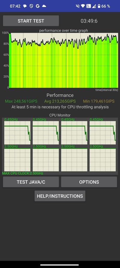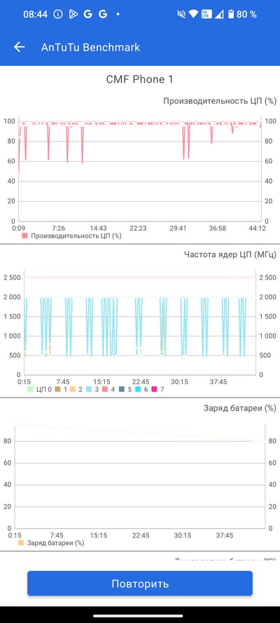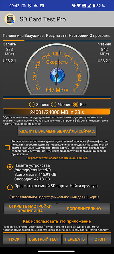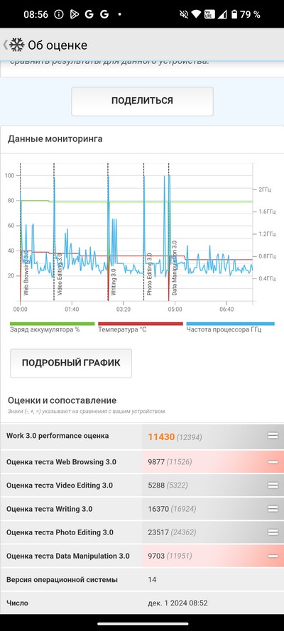 Тест на троттлинг. Потеря производительности при сильной нагрузке в среднем составляла примерно 20% - это нормально. Ну и тест памяти: память не слишком быстрая, но оно и понятно - UFS 2.1.