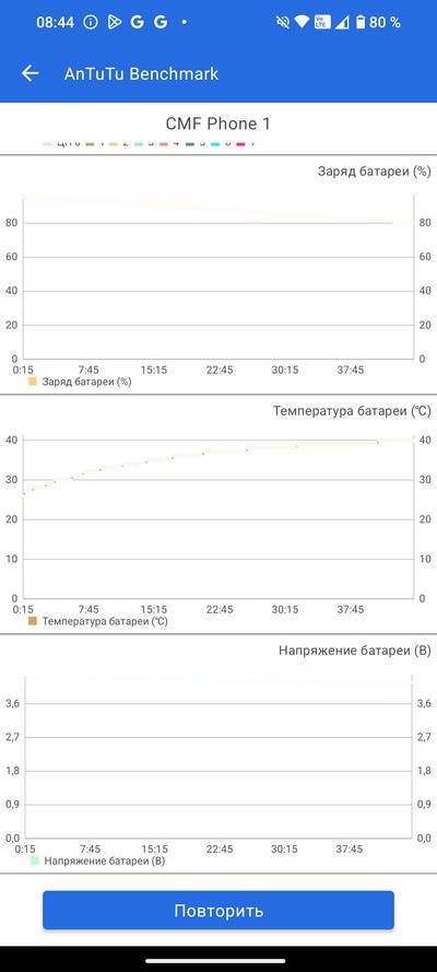 Теперь о зарядке. Максимальная мощность тут заявлена 33 Вт, однако комплектного адаптера нет. От моего универсального адаптера смартфон в начале зарядки брал где-то 30 Вт: 15 минут зарядки - 30%, 30 минут - 62%, 45 минут - 85%, 60 минут - 99%, 69 минут - 100%. Это полностью соответствует заявленной мощности зарядки.