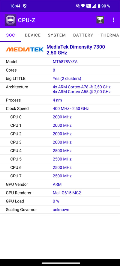 Платформа: Mediatek Dimensity 7300 (4 nm), CPU Octa-core (4x2.5 GHz Cortex-A78 & 4x2.0 GHz Cortex-A55)