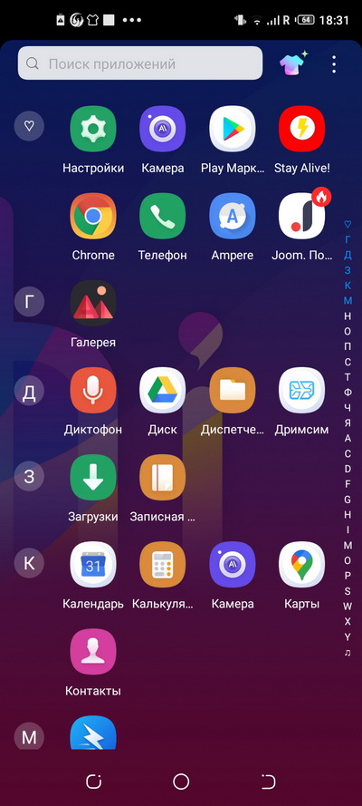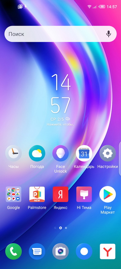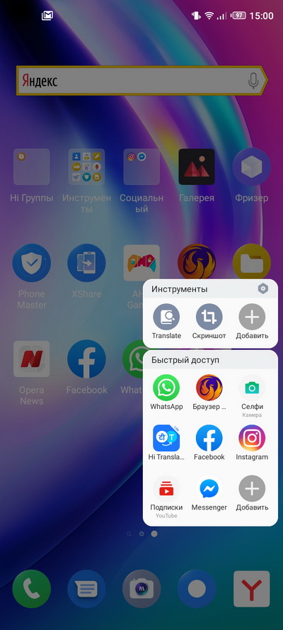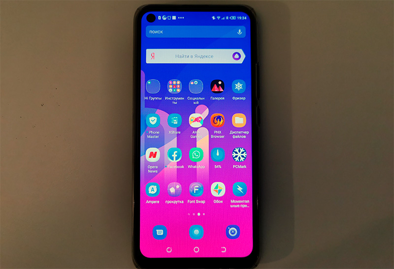 Android 9,0, оболочка HiOS. Главный десктоп. Здесь поддерживается отдельное окно установленных приложений.