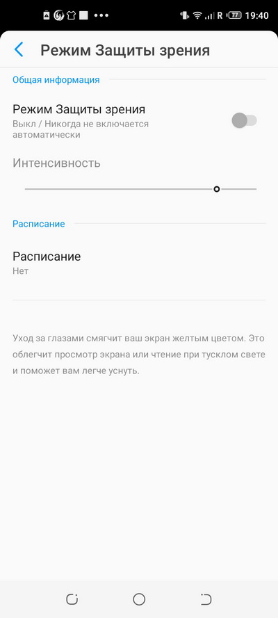 Есть режим защиты зрения (переключение в "теплую" цветовую температуру), который можно включать по расписанию.