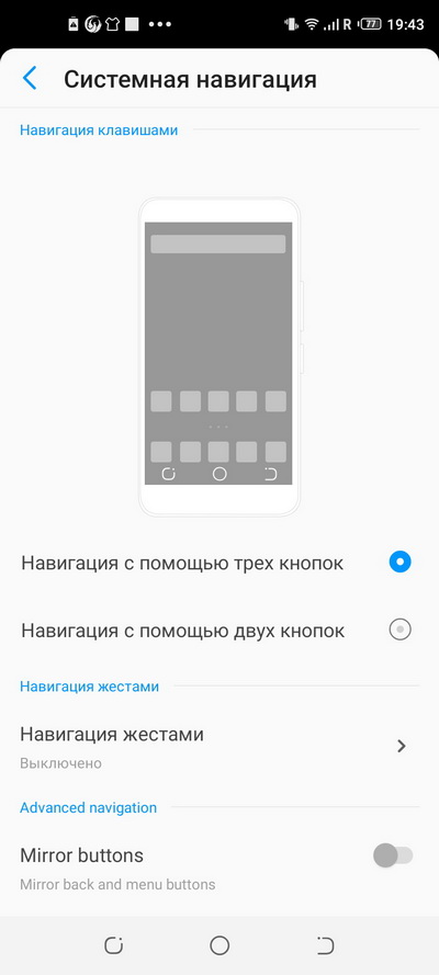 Система поддерживает несколько видов навигации. Традиционная с помощью трех кнопок, с помощью двух кнопок (одна кнопка с жестами и кнопка возврат), также с помощью стандартных андроидных жестов.