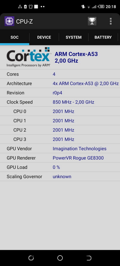 Процессор: MTK Helio P22, 4 ядра 2,0 ГГц Cortex-A53, 4 ядра 1,5 ГГц Cortex-A53