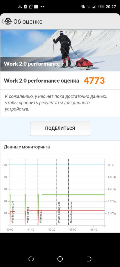 Синтетический тест PCMark - это очень важный параметр, который чисто практически показывает, как себя смартфон поведет при серьезной загрузке (у меня это называется режимом "В дороге"). Вполне приличный показатель.