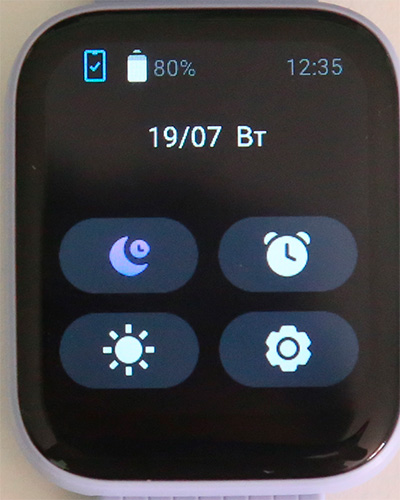Основной десктоп (циферблат) и быстрые переключатели по свайпу вниз. Там информация, режим "Не беспокоить", настройка яркости дисплея, будильник и общие настройки.