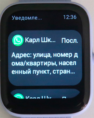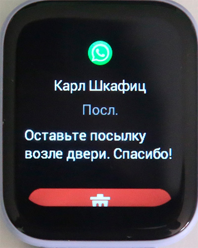 Пришедшее уведомление (большое уведомление можно раскрыть и прочитать), список уведомлений по свайпу вверх от циферблата. Что интересно, в настройках приложения есть быстрые ответы на SMS, но в часах это не реализовано: на SMS нельзя ответить сообщением.
