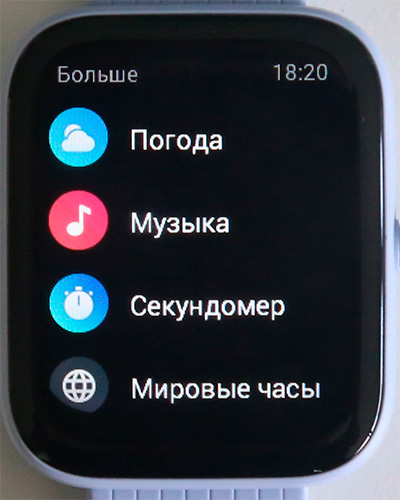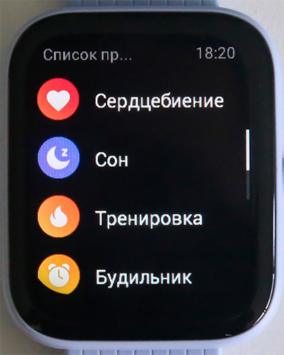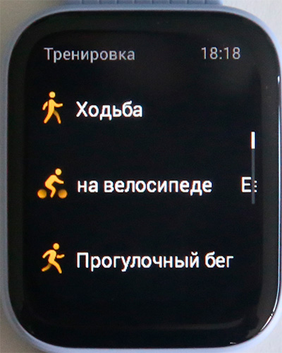 Список тренировок (по умолчанию вызывается длинным нажатием на кнопку), старт тренировки. В данной модели GPS нет, но если часы сопряжены со смартфоном, то они берут данные GPS со смартфона, причем для этого не нужно отдельно ничего запускать.