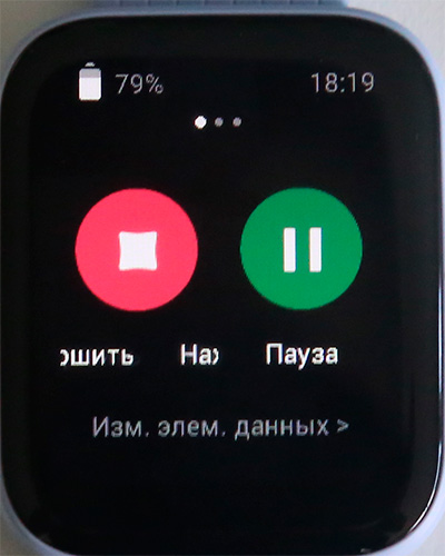 Окно тренировки, оно скроллируется вверх - там разные экраны с информацией. Свайп вправо - остановить тренировку, поставить на паузу. Автоматическая пауза в настройках есть.